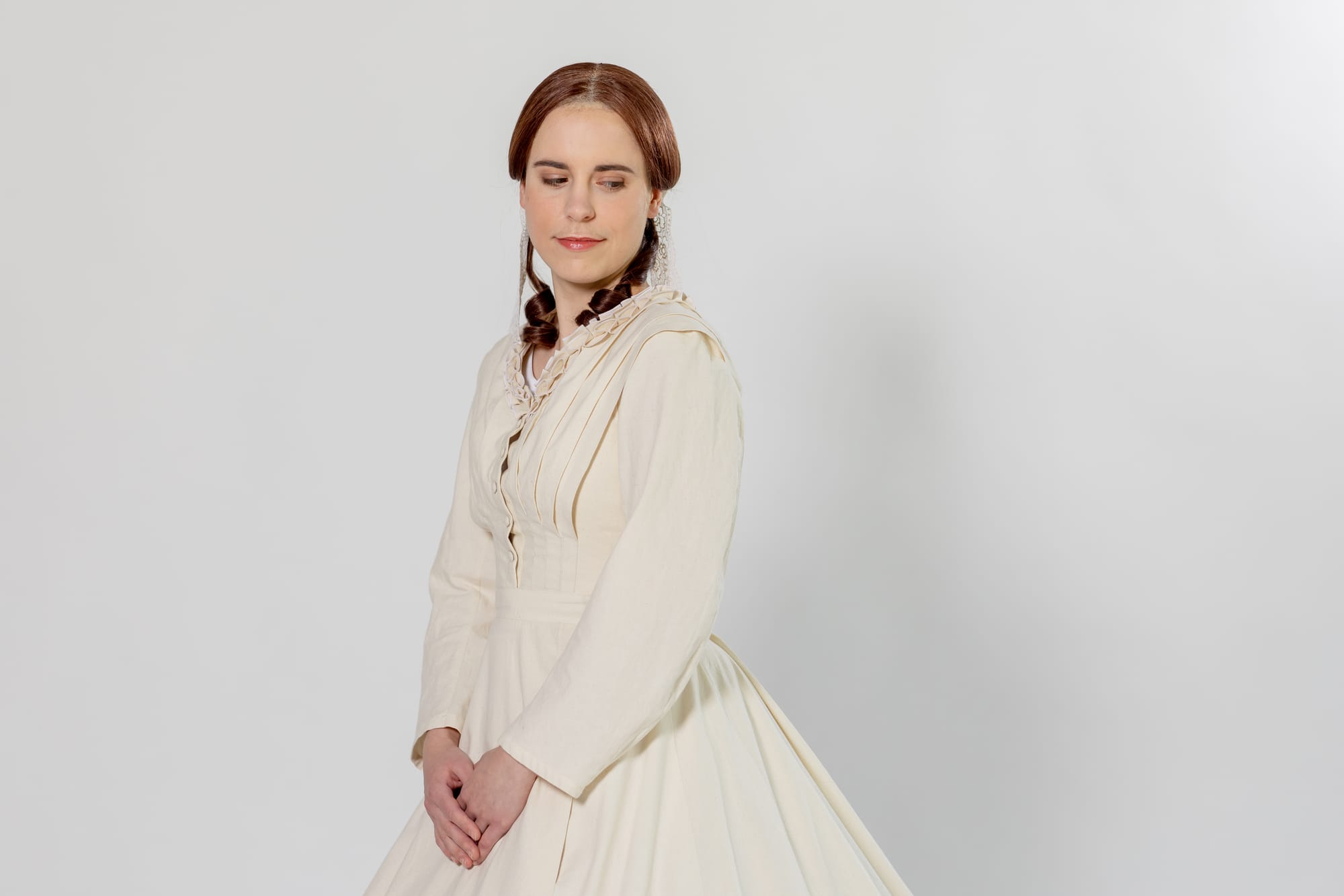 Das Kleid habe ich in meiner Ausbildung zur Damengewandmeisterin gemacht. Es besteht aus einem Unterbau aus Draht, einem Unterrock mit vielen Rüschen, historischem Unterhemd und Unterhose, einem Korsett und dem Überkleid.
